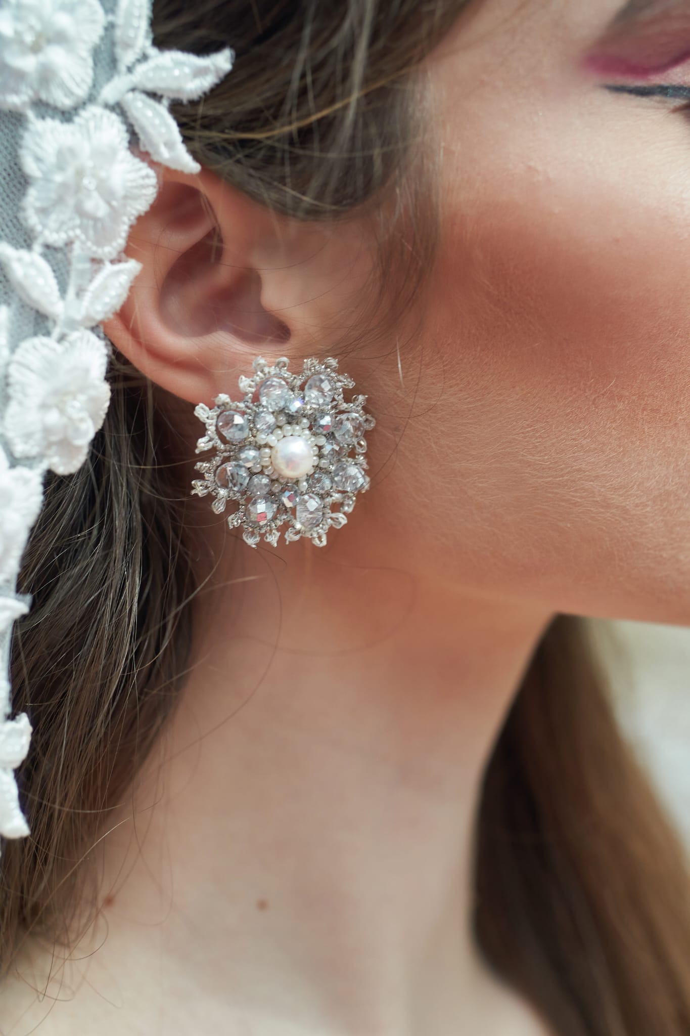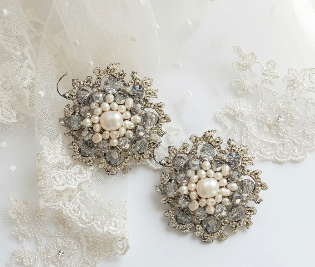 Realizzato con l’antica tecnica del pizzo chiacchierino e impreziosito con perle di acqua dolce e cristalli argentati