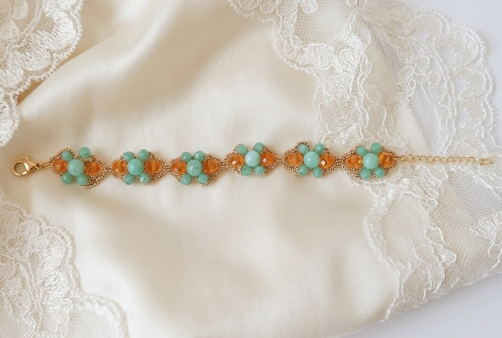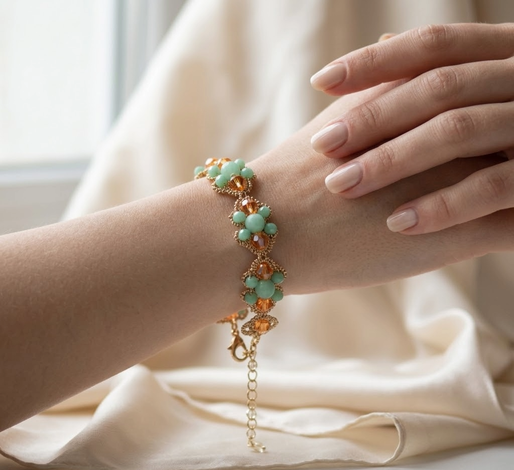 Realizzato con l’antica tecnica del pizzo chiacchierino e impreziosito con cristalli arancione e verdi