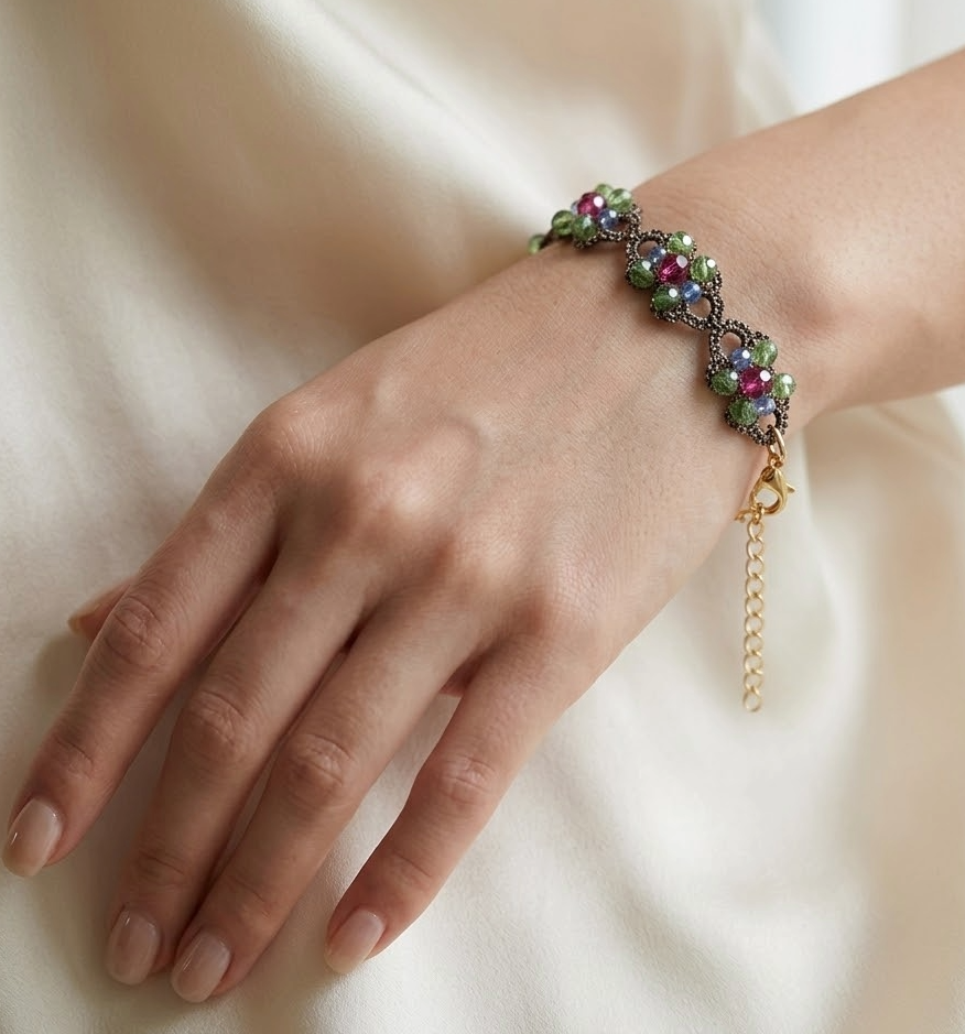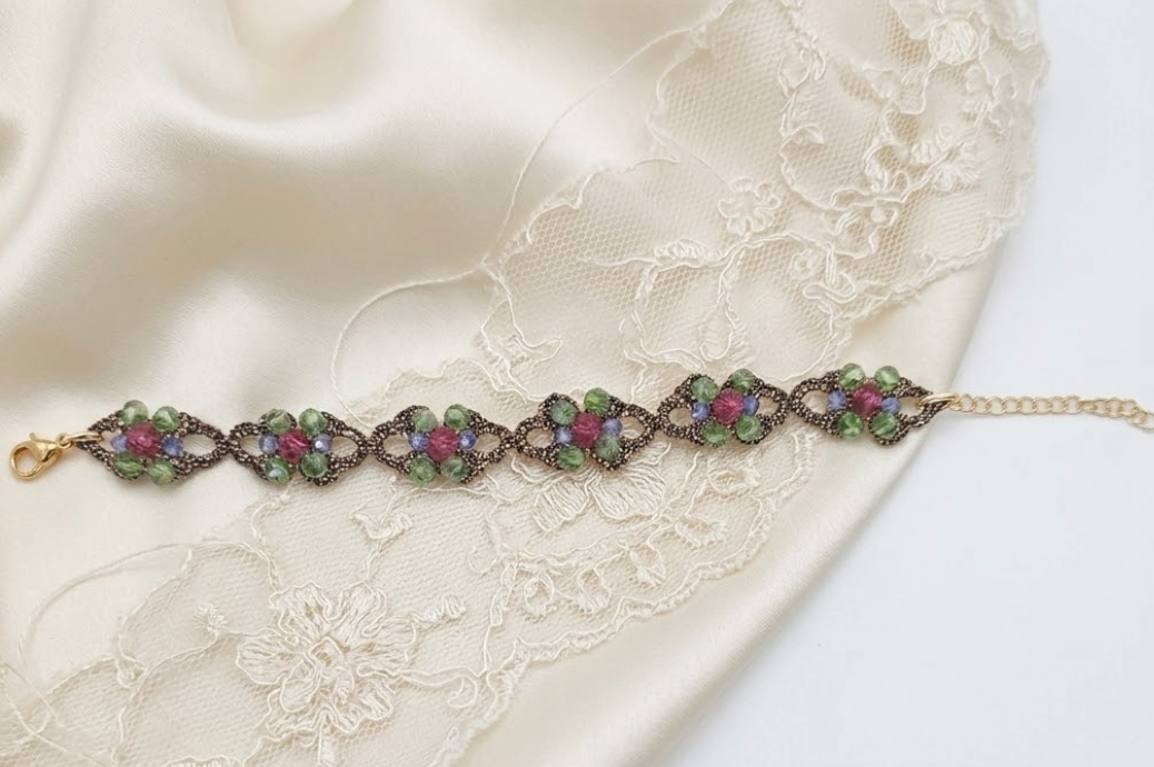 Realizzato con l’antica tecnica del pizzo chiacchierino e impreziosito con cristalli viola, verdi e azzurri