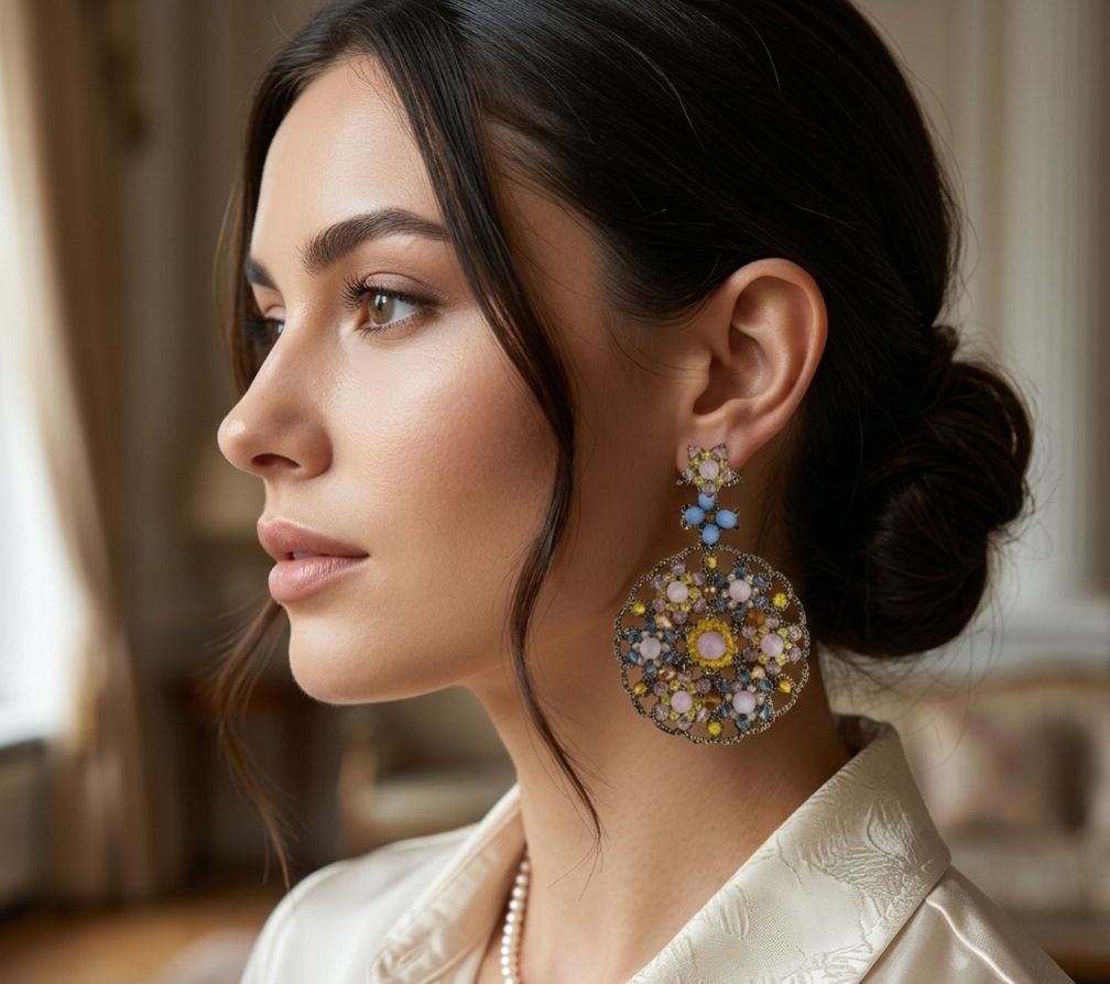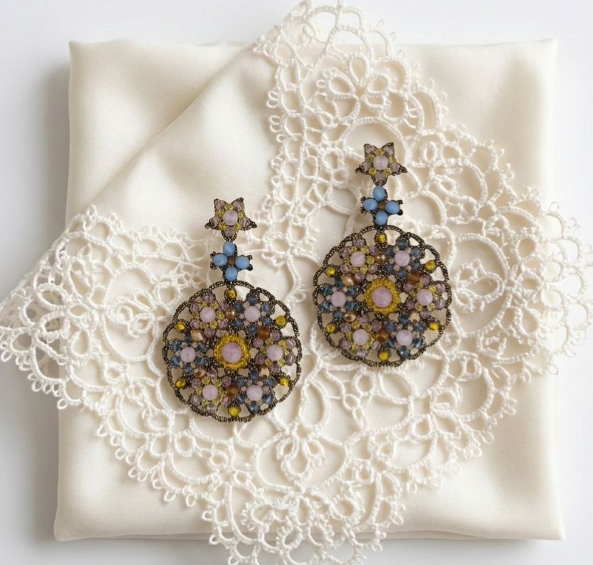 Orecchini realizzati con l’antica tecnica del pizzo chiacchierino e impreziositi con ametista, cristalli azzurri e gialli