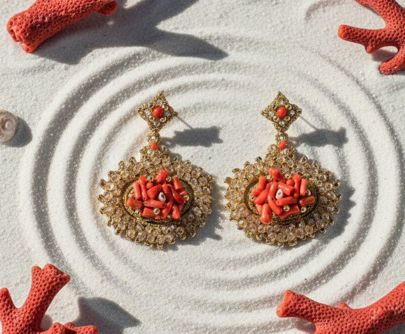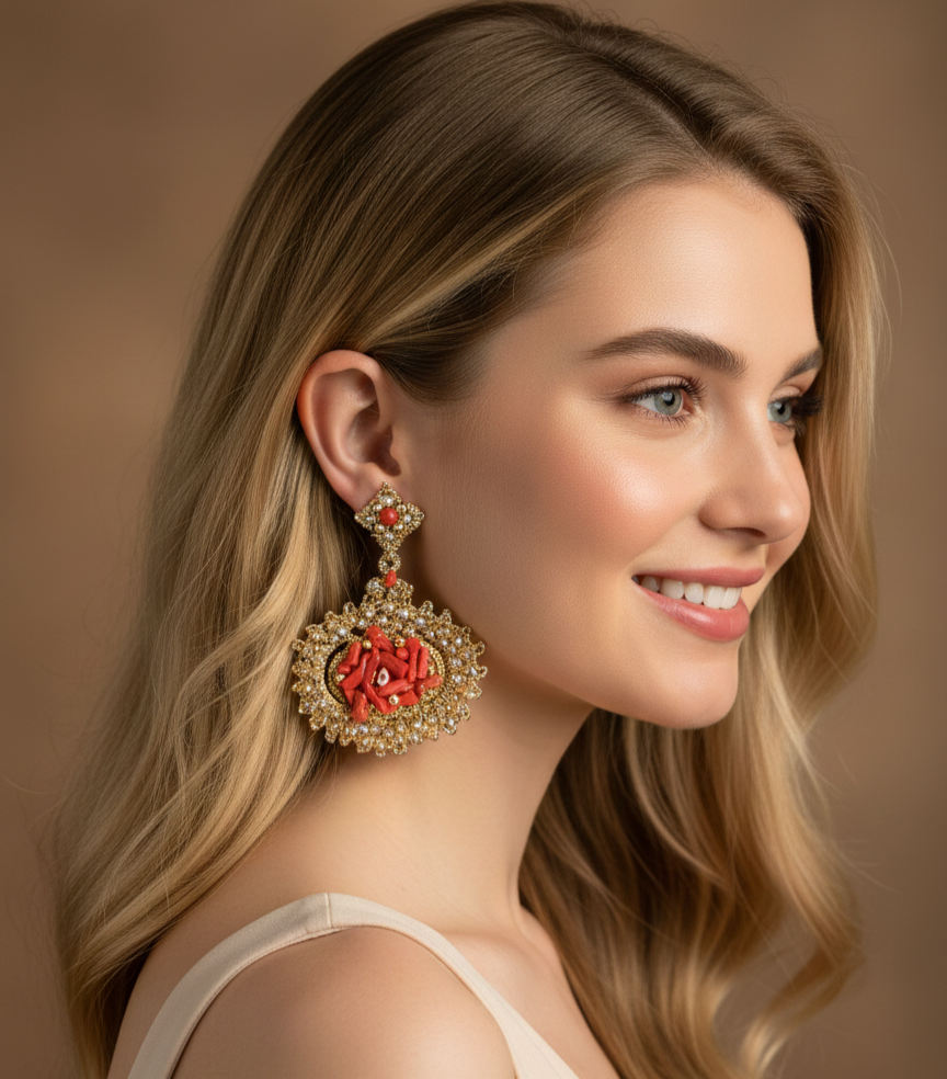 Gli orecchini Charlotte Scaglie di Corallo sono un vero tributo alla bellezza del Mediterraneo. Questo modello si distingue per il cuore pulsante di scaglie di corallo rosso, finemente incastonate al centro di una sontuosa montatura in pizzo chiacchierino dorato interamente tempestata di cristalli luminosi. Se cerchi dei gioielli fatti a mano in pizzo chiacchierino siciliano che sappiano coniugare la maestosità del design barocco con l’autenticità dei materiali naturali, gli Charlotte sono il pezzo perfetto per illuminare i tuoi eventi più importanti.