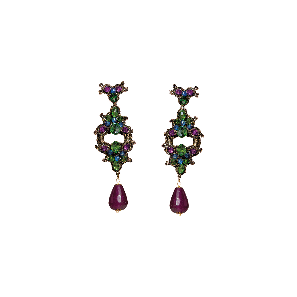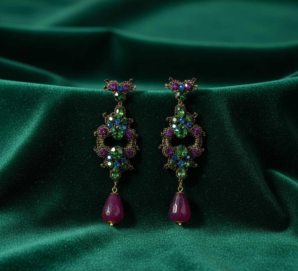 Questi orecchini lavorati a mano con l’antica tecnica del pizzo chiacchierino, sono un emblema di lusso e geometria, evocando il fascino misterioso delle civiltà antiche con una palette di colori vibrante e audace. L’uso di finiture scure sui bordi e la lavorazione complessa del metallo ricordano l’oreficeria egizia o mediorientale, conferendo un’aria di gioiello ereditato e di grande valore storico. Sono perfetti per aggiungere un tocco di drammaticità e opulenza a un look da sera o per accentuare un abito elegante in colori neutri. La loro dimensione li rende visibili e d’impatto, pur mantenendo un’eleganza compatta.