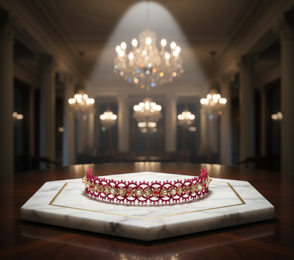 Questo choker lavorato interamente a mano con l’antica tecnica del pizzo chiacchierino, è un capolavoro di design che fonde l’eleganza vintage con la brillantezza dei gioielli contemporanei, creando un accessorio audace e sofisticato. Questo accessorio evoca un’estetica opulenta e romantica, perfetta per serate di gala, eventi a tema, o per trasformare un abito da sera semplice in un look di grande impatto. È l’ideale per chi ama i gioielli che fondono il fascino retrò con un tocco moderno e audace.