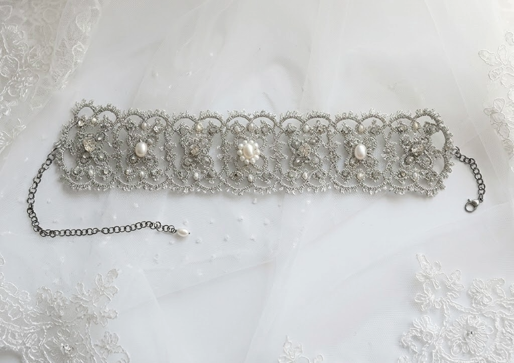 realizzato con l’antica tecnica del pizzo chiacchierino e impreziosito con perle di acqua dolce e cristalli argentati