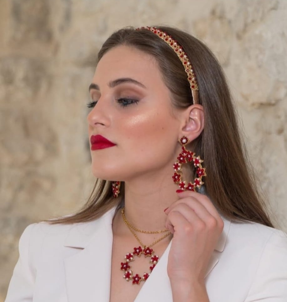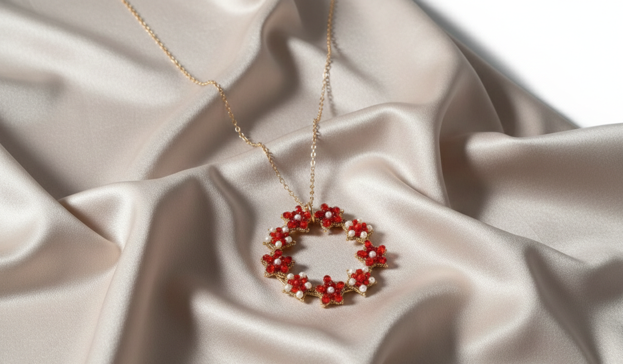 Collana rossa con perle Esalta la tua bellezza con questa splendida collana artigianale, un gioiello unico interamente realizzato a mano con la raffinata tecnica del pizzo chiacchierino. Il pendente a forma di ghirlanda circolare รจ composto da delicati fiori rossi impreziositi da perle bianche centrali, montati su una sottile ed elegante catena dorata che dona immediata luce al dรฉcolletรฉ. Leggera e sofisticata, รจ l’accessorio ideale per rendere indimenticabile un outfit da cerimonia o per aggiungere un tocco di lusso artigianale al tuo stile quotidiano Catena e moschettone in acciaio inossidabile dorato