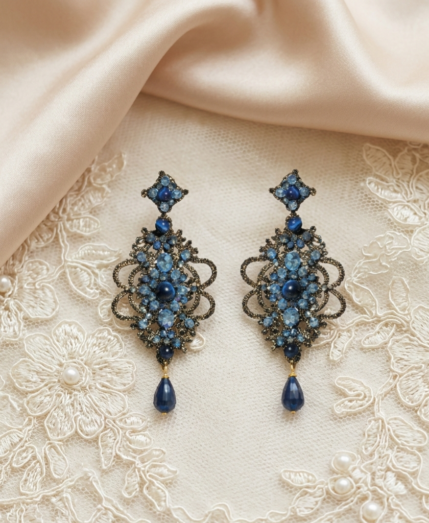 Orecchini forma goccia lavorati con l'antica tecnica del pizzo chiacchierino e impreziositi con pietra occhio di tigre blu e cristalli blu sfaccettati e perno in argento