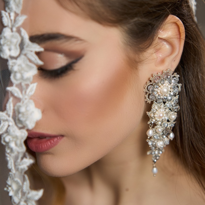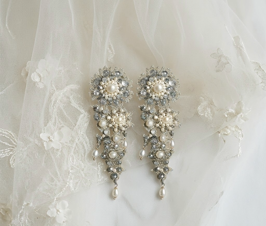 Lavorato a mano con l’antica tecnica del pizzo chiacchierino e impreziosito con perle di acqua dolce e cristalli argentati